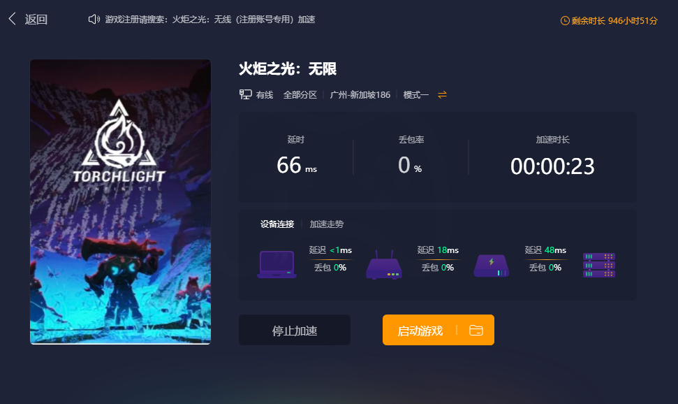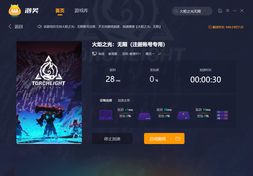 5、注册完成后,在泡 芙 加速 器中搜索“火炬之光:无限”进行加速启动游戏,登录账号即可畅玩无限不卡顿。