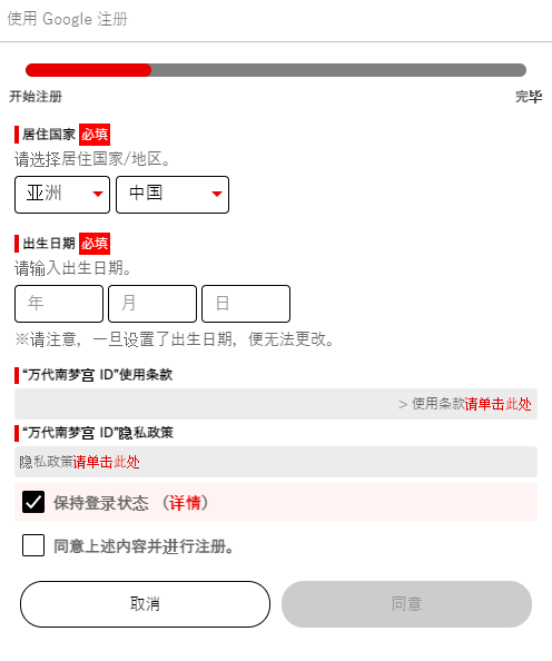 4、点击“使用Google注册”后,我们需要填写地区、生日、ID等信息,然后勾选协议并点击同意;