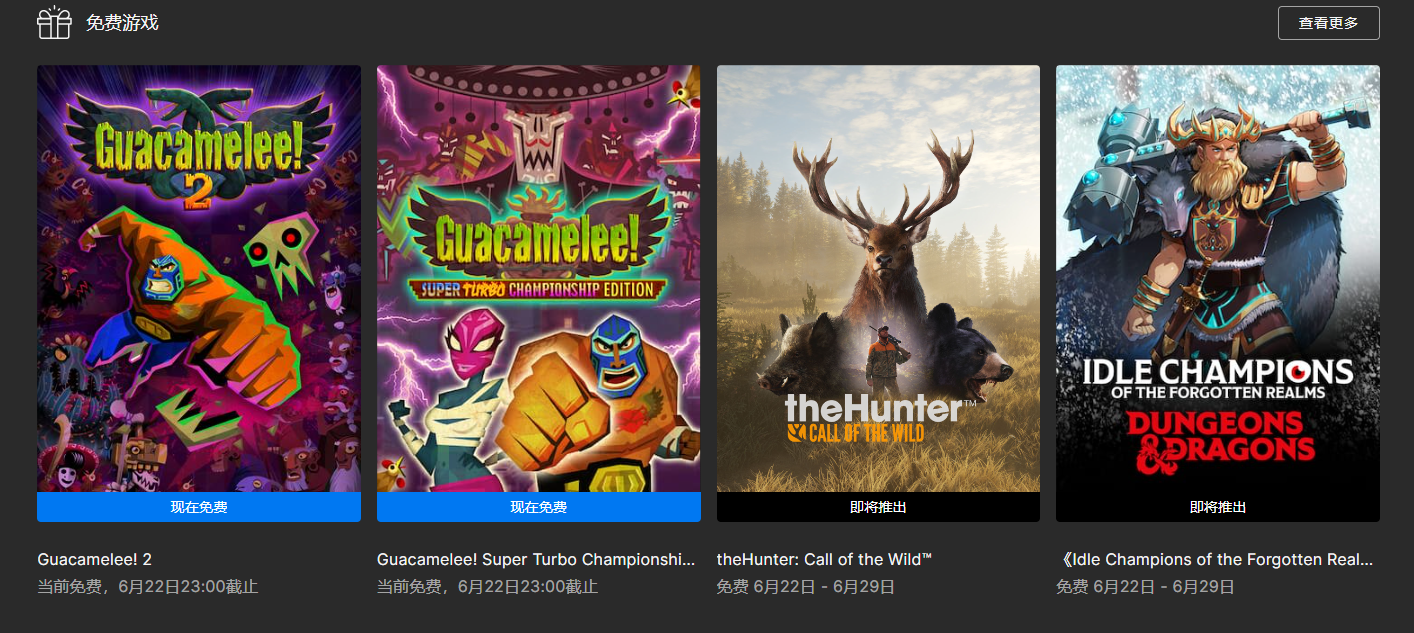 Epic游戏商城喜加二最新活动于6月22日继续更新,玩家们可以在商城中限时领取免费游戏,本次免费的游戏有:《猎人荒野的召唤》、《遗忘国度之闲置冠军》两款,截止日期到6月29日,喜欢的玩家不要错过啦~