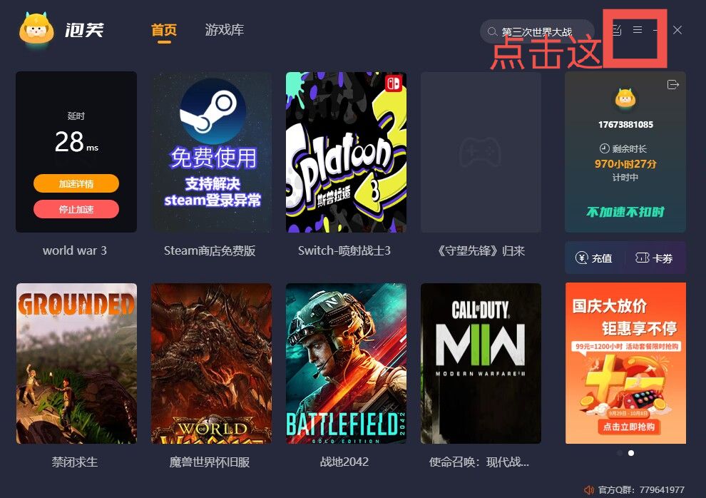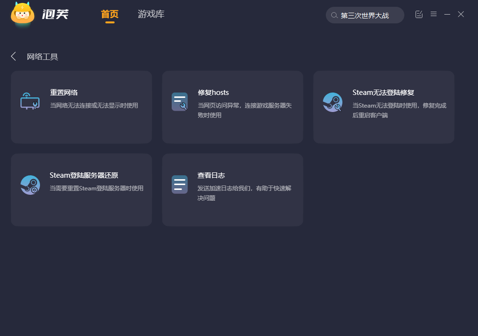 重启游戏网络重置成功之后再重启电脑,在泡芙加速器中搜索“第三次世界大战”点击加速启动游戏就可以了。