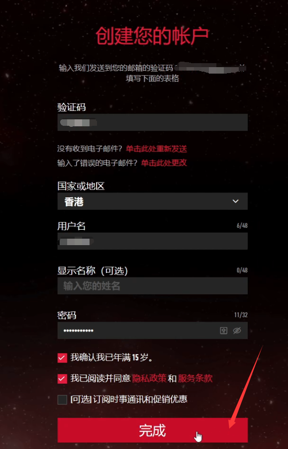 6、填写邮箱收到的验证码、地区、用户名、密码后点击完成;